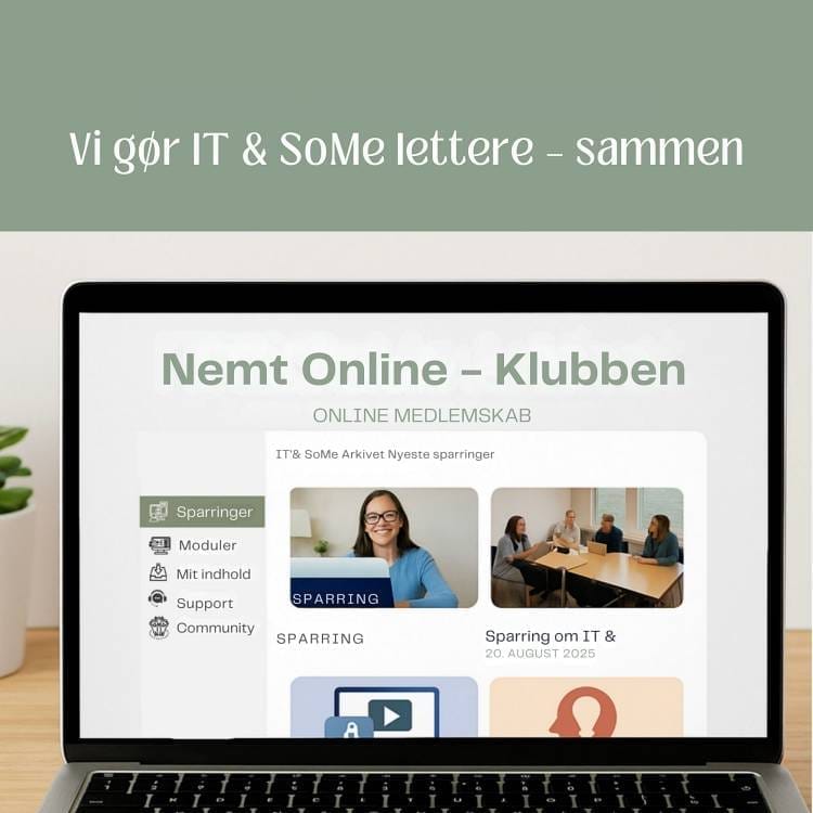Canva | Systeme.io | Facebook | Instagram | Annoncer | Billeder | Reels og video | Nyhedsbreve | Automation | Strategi | Opsætning af platforme | SoMe-sikkerhed | Stories – og meget mere.
